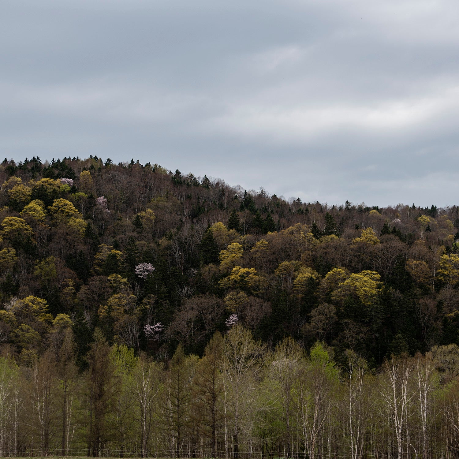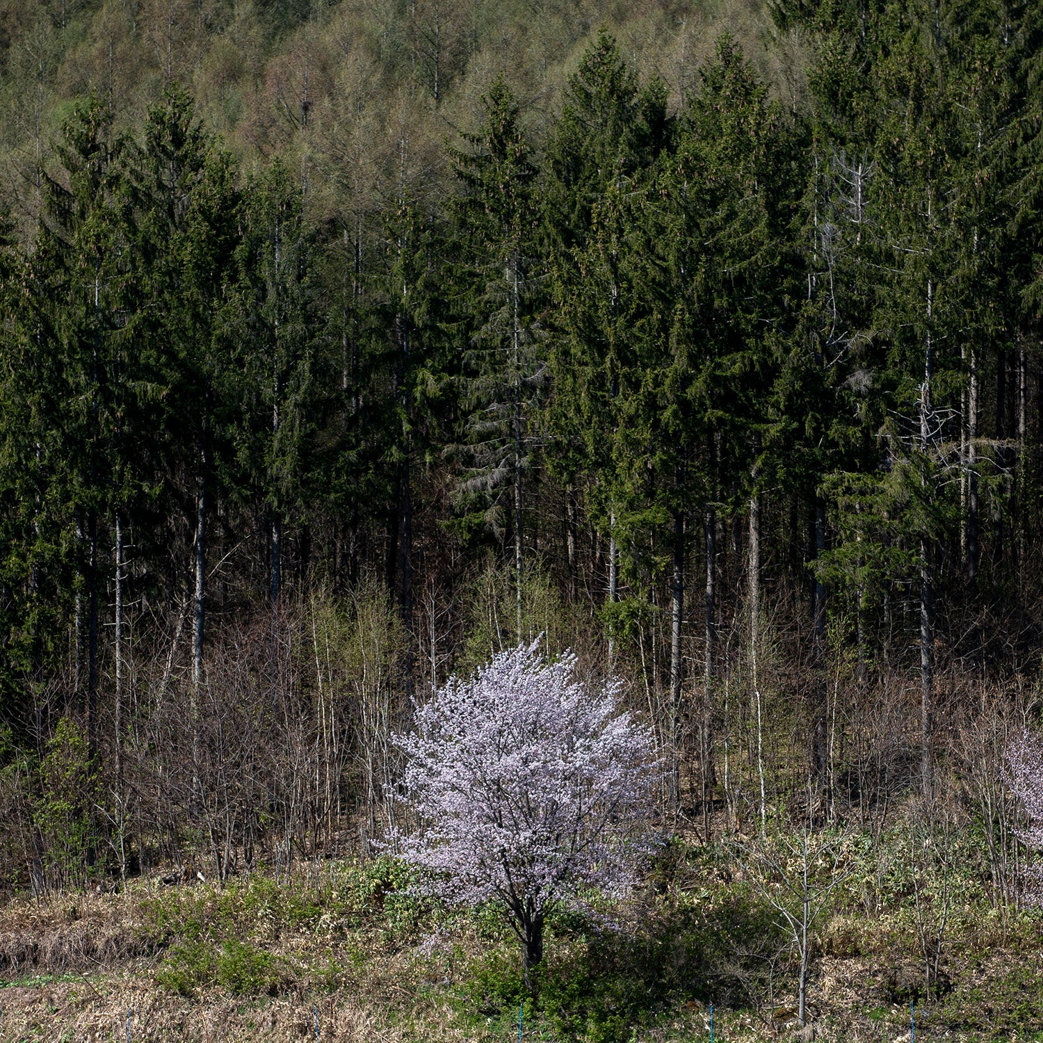 桜の咲く季節に山を見ると、ポツポツと花の咲くヤマザクラの木が。森の木々の中でも数の少ない希少な樹種であることがわかります。