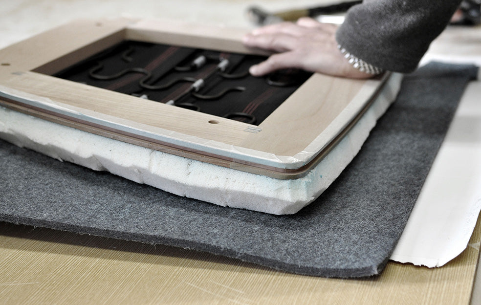 椅子やソファにはウレタンやポケットコイルを使うのが一般的で、私たちの家具の一部でも使用していますが、なるべく天然の素材を選び座り心地を追求しています。ヤシの木の繊維で作るパームや、天然ゴムのラテックス、羊毛フェルト…これらの素材を自社の張り職人がひとつひとつ手作業で家具に仕上げます。表面的には見えない部分にも、こだわりが詰まっています。