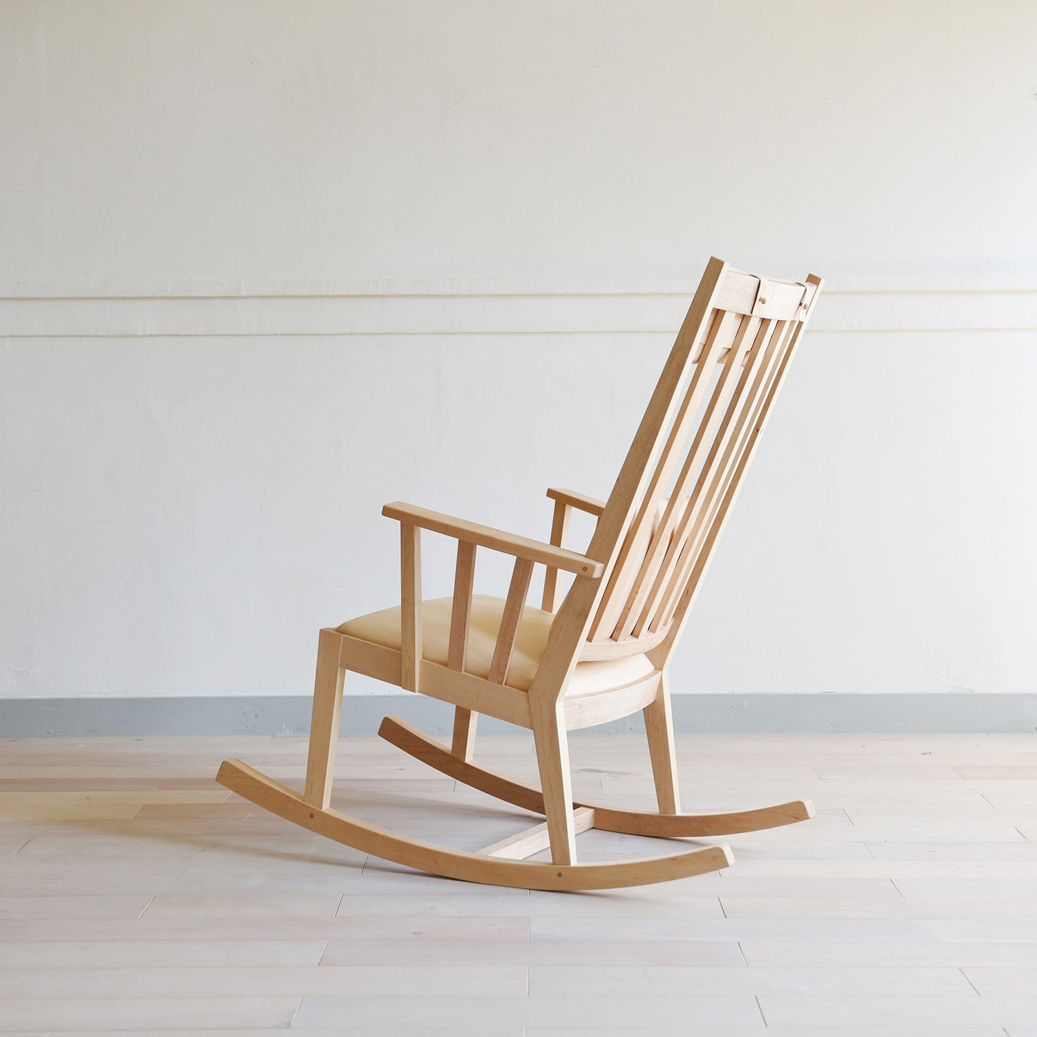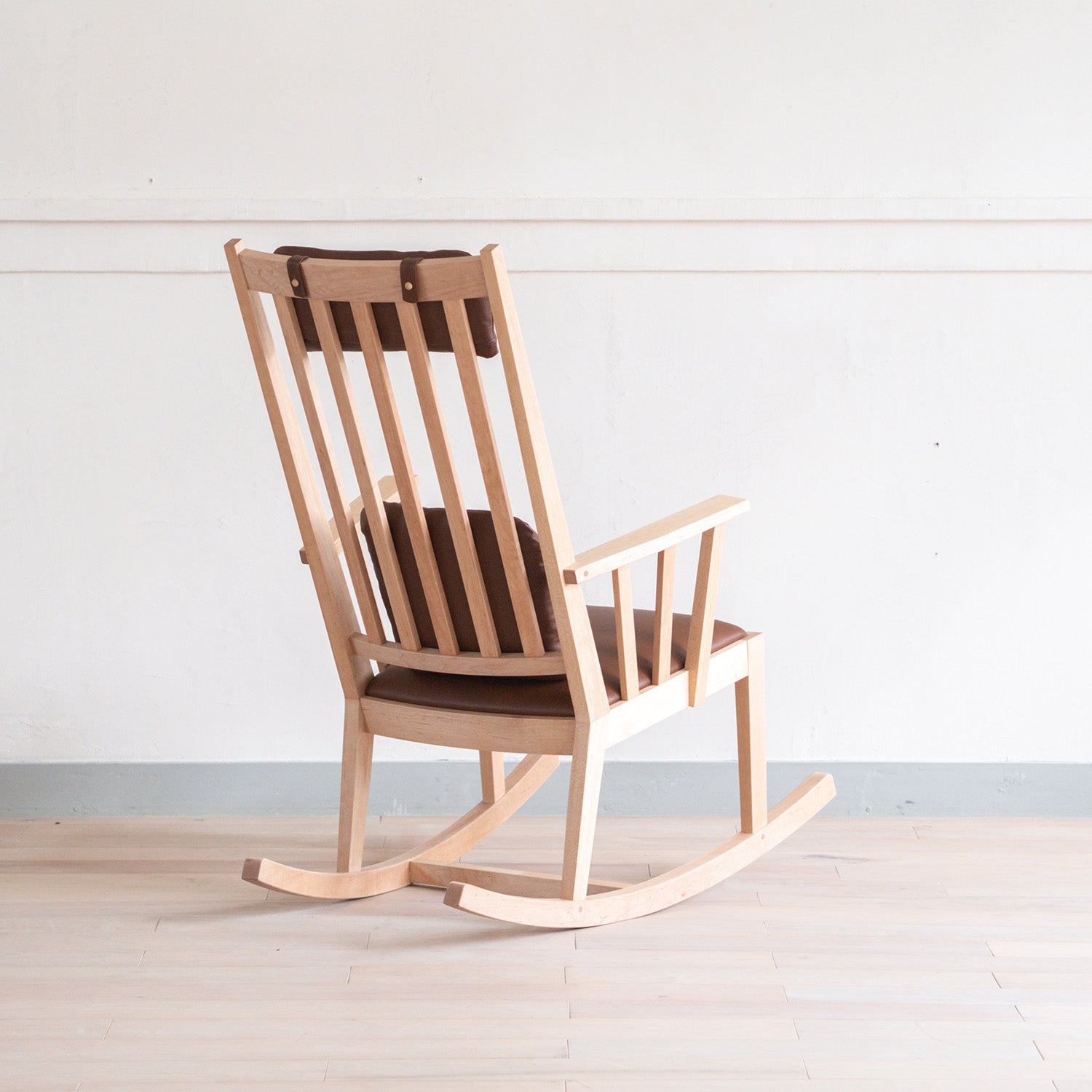 北海道産の無垢材を使い丁寧に作り上げたロッキングチェア。ヘッドレストを固定する細かなパーツも無垢材を使っています。