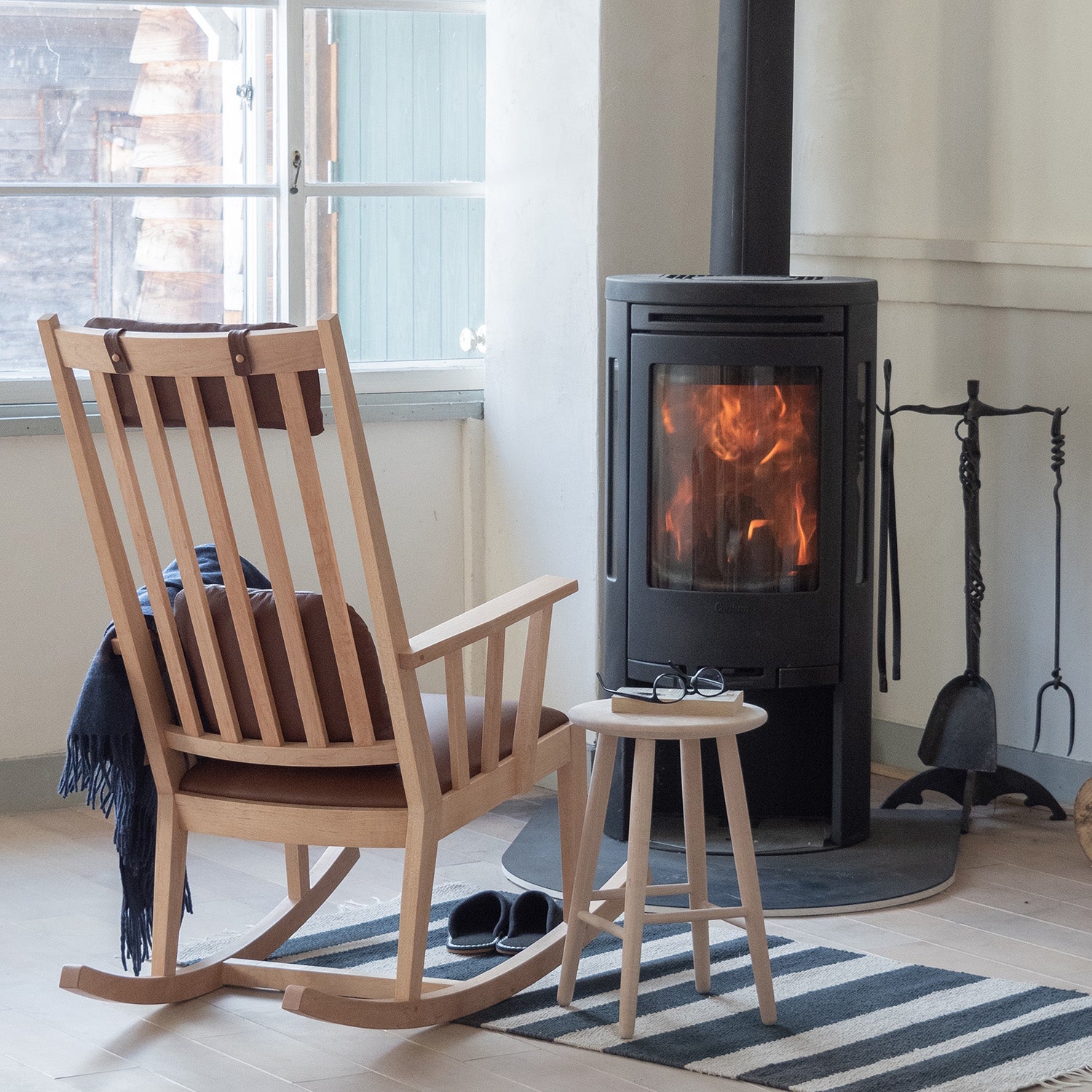 やさしい揺れが心地よいロッキングチェア。高さのある背もたれに、ヘッドレストと背にはクッション(フェザー100%)がセットされています。